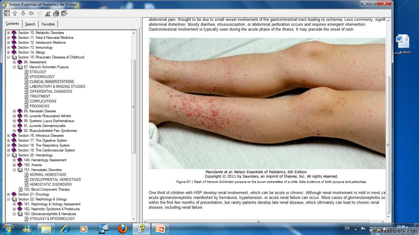 Therapy for HSP is supportive. A short-term course of nonsteroidal anti-inflammatory drugs can be administered for the acute arthritis. Systemic corticosteroids usually are reserved for children with gastrointestinal disease and provide significant relief of abdominal pain. Renal manifestation may require in addition immunosuppresive therapyPROGNOSIS