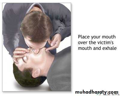 Tilt the head back and listen for. If not breathing normally, pinch nose and cover the mouth with yours and blow until you see the chest rise.