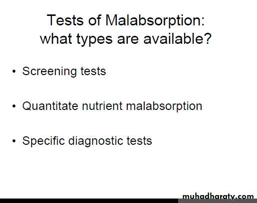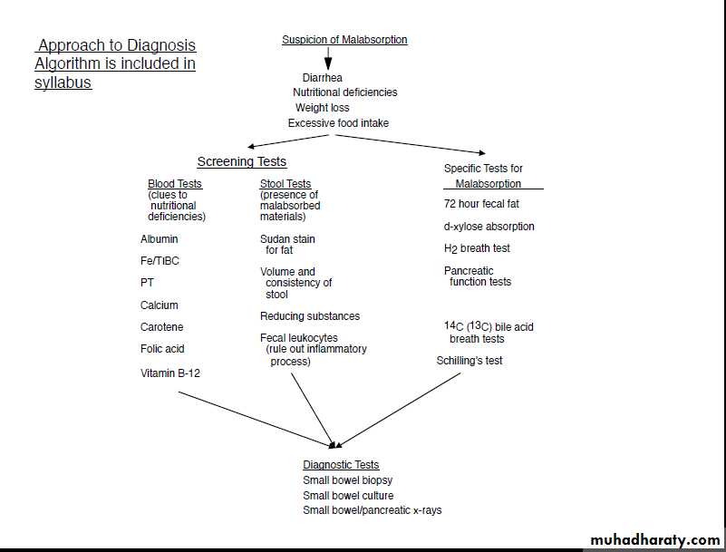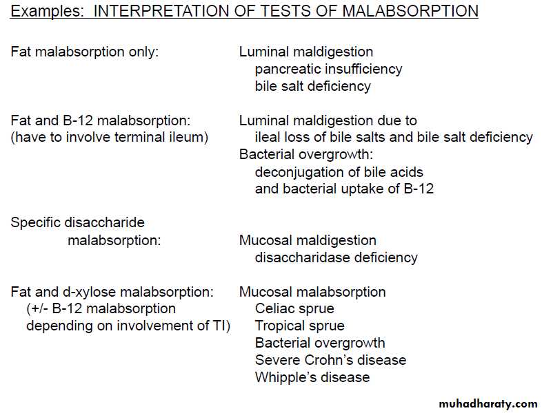 Selection of tests in evaluation malabsorptionQuantitaive fecal fatNormalAbnormalD-xylose testNormalAbnormalAbd. Radiograph14 C-D-xylose testBentiromide testCT-abd.NormalSmall intestinal BxAbnormal Jej culture TetracyclinThen repeat breath test