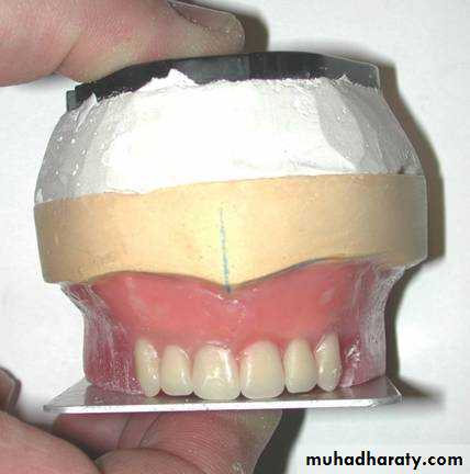 mark the midline of the patient’s face by placing a dot on the incisive papilla and marking this midline on the maxillary anterior land area, extending down the front of the cast. The incisive papilla is a much more reliable landmark for the midline than the labial frenum.