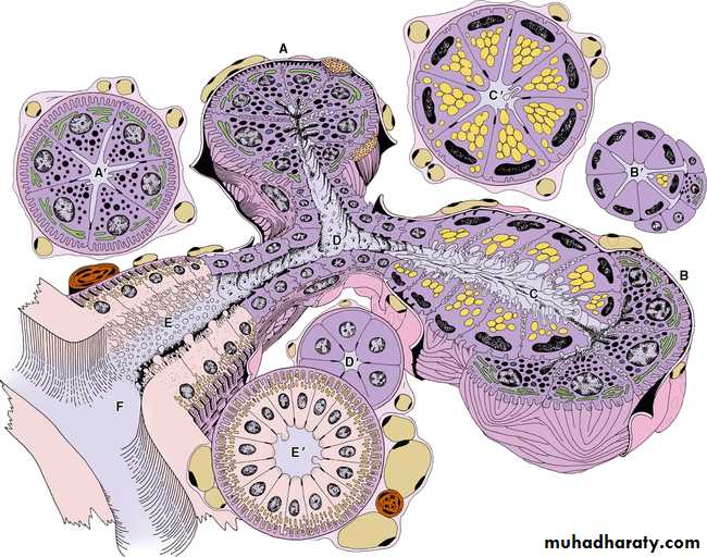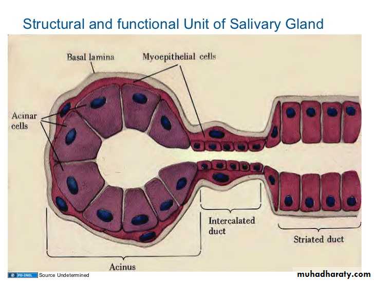 The duct system : secretory acini empty into the intercalated ducts lined by dark stained cuboidal epithelium, they merge to form striated ducts lined by tall columnar light stained cells with vertical striation which fuse to form larger interlobular duct (lined by pseudostratified epithelium), the inter lobular ducts join to form the major duct lined by stratified epithelium.