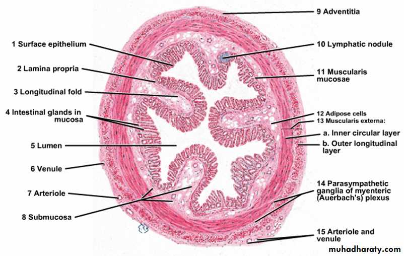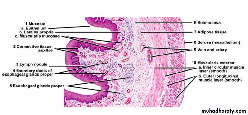D- Serosa:- (adventitia and mesothelium) contains blood vessels and adipose tissue.