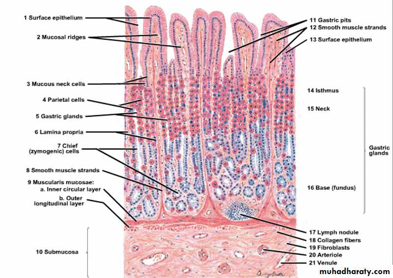 1. Stem cells:-Are columnar cells with basal nuclei, having high rate of mitosis, they are able to replace all types of epithelial cells of gastric mucosa.