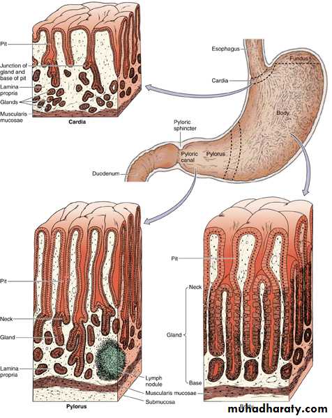 This region shows deep gastric pits into which open tubular mucous glands extending down to the muscularis mucosa similar to the cardiac glands. These glands are lined by mucous cells and scattered parietal cells particularly close to the pyloric sphincter, the glands secrete mucin and enzyme lysozyme.
