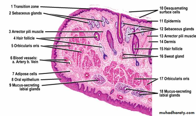 Each lip composed of a core of skeletal muscle (orbicularis oris) embedded in a fibro-elastic connective tissues. The external surface of the lips is covered by skin that contains many hair follicle, sebaceous glands and sweat glands. At the free margin of the lip there is an area of transitional zone between the outer skin and the mucous membrane of the mouth cavity. The epith. covering this margin ( red margin) is not heavily keratinized (translucent), therefore, prominent blood vessels can be easily seen.The inner surface of the lip is lined by mucuos membrane and consist of str. sq. non kera.epithelium lying on a connective tissue lamina propria, small groups of mucous glands called labial glands are situated inside the lip and produce their secretion to the surface of the lip by small ducts, because there are no sweat gland or sebaceous gland on the lip margin, the lips must be wetted with the saliva by liking them with the tip of the tongue, failure to do this will cause will cause the lips to be dried.6