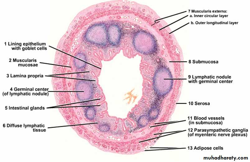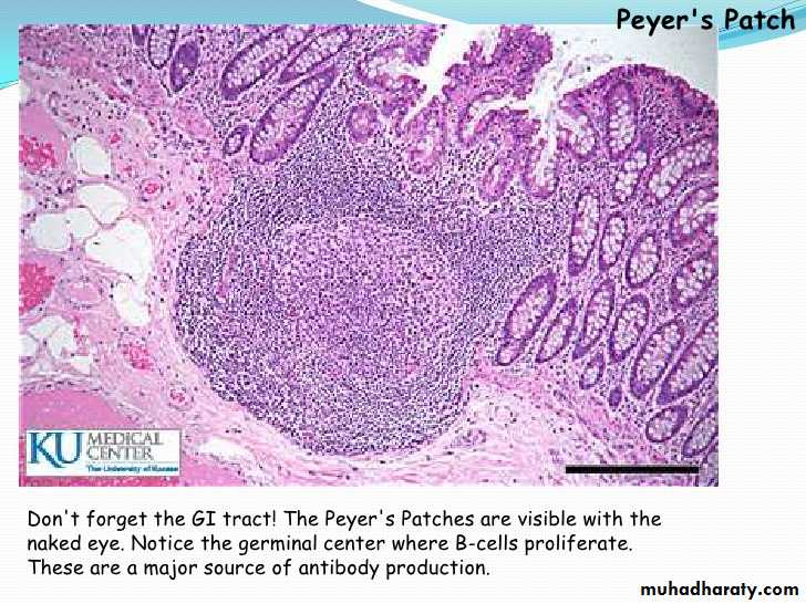 -Ileum: aggregation of lymphoid tissue to form large nodules called (Peyer’s patches) which may expands in the lamina propria , splits the muscularis mucosa and extend into the submucosa.