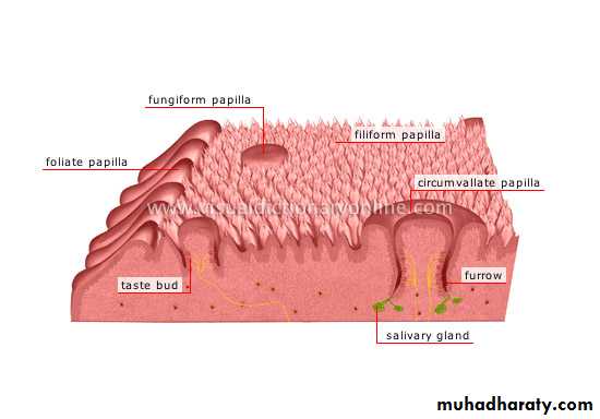Is a highly muscular organ composed of striated muscle that function is chewing, swallowing, and speech. The upper surface of the tongue is divided into anterior two thirds and posterior one third by V- shaped sulcus called (sulcus terminalis) which is marked by foramen cecum.The upper surface of anterior two third shows small projections called papillae which are four types: