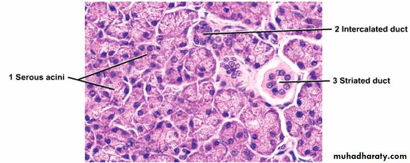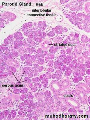 • Histologically: Parotid gland surrounded by fibrous tissue capsule from which fibrous septa dividing the gland into lobes and each lobe is subdivided into many lobules, one of the characteristic feature of the gland is the presence of adipose tissue, each lobule composed of branched tubulo alveolar acini of serous type, purely secrete serous fluid. Serous cells are cubidal or pyramidal surrounding small lumen, have spherical centrally located nucleus, luminal surface of the cell cytoplasm contain zymogen granules that stain purple by using H& E stain while RER found at the basal part of the cytoplasm, the duct within the lobule called intralobular consist of intercalated and striated duct.