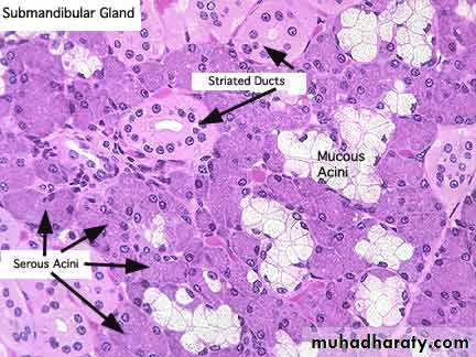 The gland lie on each side of the neck just below the mandible, their duct open into the floor of the mouth on each side of the frenulum of the tongue just behind the lower incisor teeth. The gland is surrounded by fibrous capsule and from which fibrous septa divide the gland into lobes and lobules, no adipose tissue. The secretory part composed of tubulo- alveolar acini of serous and mucous type but majority are serous alveoli.20