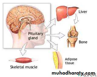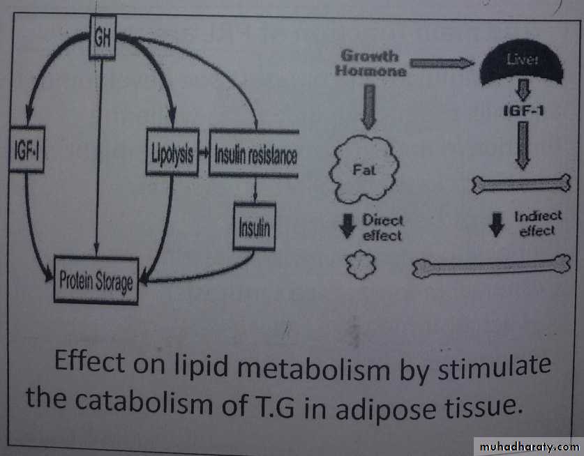 The main function of GH: Effect on protein metabolism by increase amino acids transport to muscle cells for build protein. Effect on carbohydrate metabolism by increase glucose level in blood then stimulate gluconegenolysis and inhibit glycolysis. Effect on lipid metabolism by stimulate catabolism of T.G in adipose tissue. Retention certain minerals them its stimulate bone growth.