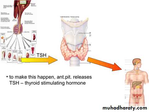 The main function of TSH:- Stimulate the thyroid hormone (T3,T4).- Control of iodide concentration and converted it to organic compound by binding with thyroglobulin then it was hydrolyze.- Increase the concentration and synthesis of protein, phospholipid and nuclic acid.- Lipolysis the nutrient lipid in adipose tissues. TRH TSH T3,T4hypothalamus anterial pituitary target hormone