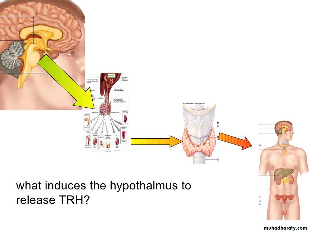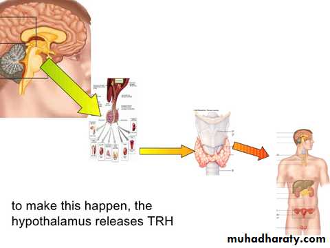 The hypothalamus produces Thyroid Releasing Hormone (TRH) that signals the pituitary to tell the thyroid gland to produce more or less of T3 and T4 by either increasing or decreasing the release of a hormone called thyroid stimulating hormone (TSH).