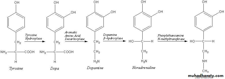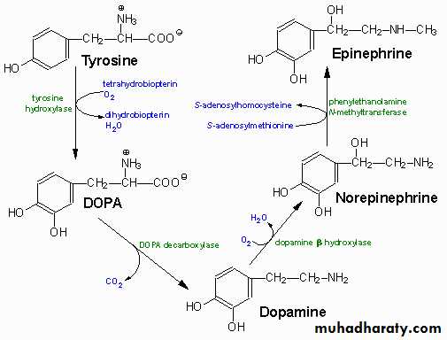 Adrenaline and noradrenaline include increased heart rate and blood pressure, blood vessel constriction in the skin and gastrointestinal tract, smooth muscle, dilation, and increased metabolism, all of which are characteristic of the fight-or-flight response. Release of catecholamines is stimulated by nerve impulses, and receptors for catecholamines are widely distributed throughout the body.