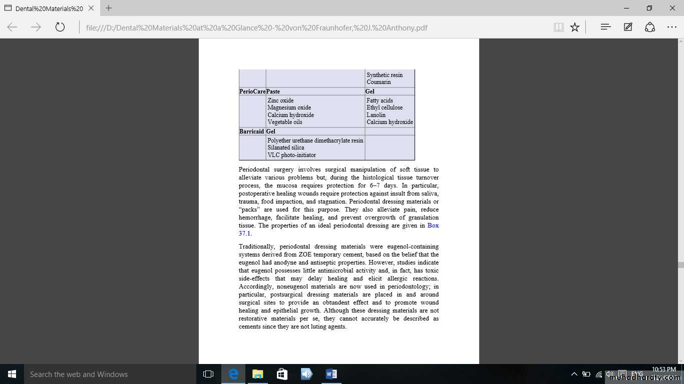 The properties of an ideal periodontal dressing Traditionally, periodontal dressing materials were eugenol-containing systems derived from ZOE temporary cement, based on the belief that the eugenol had anodyne and antiseptic properties. However, studies indicate that eugenol possesses little antimicrobial activity and, in fact, has toxic side-effects that may delay healing and elicit allergic reactions. Accordingly, noneugenol materials are now used in periodontology; in particular, postsurgical dressing materials are placed in and around surgical sites to promote wound healing and epithelial growth.