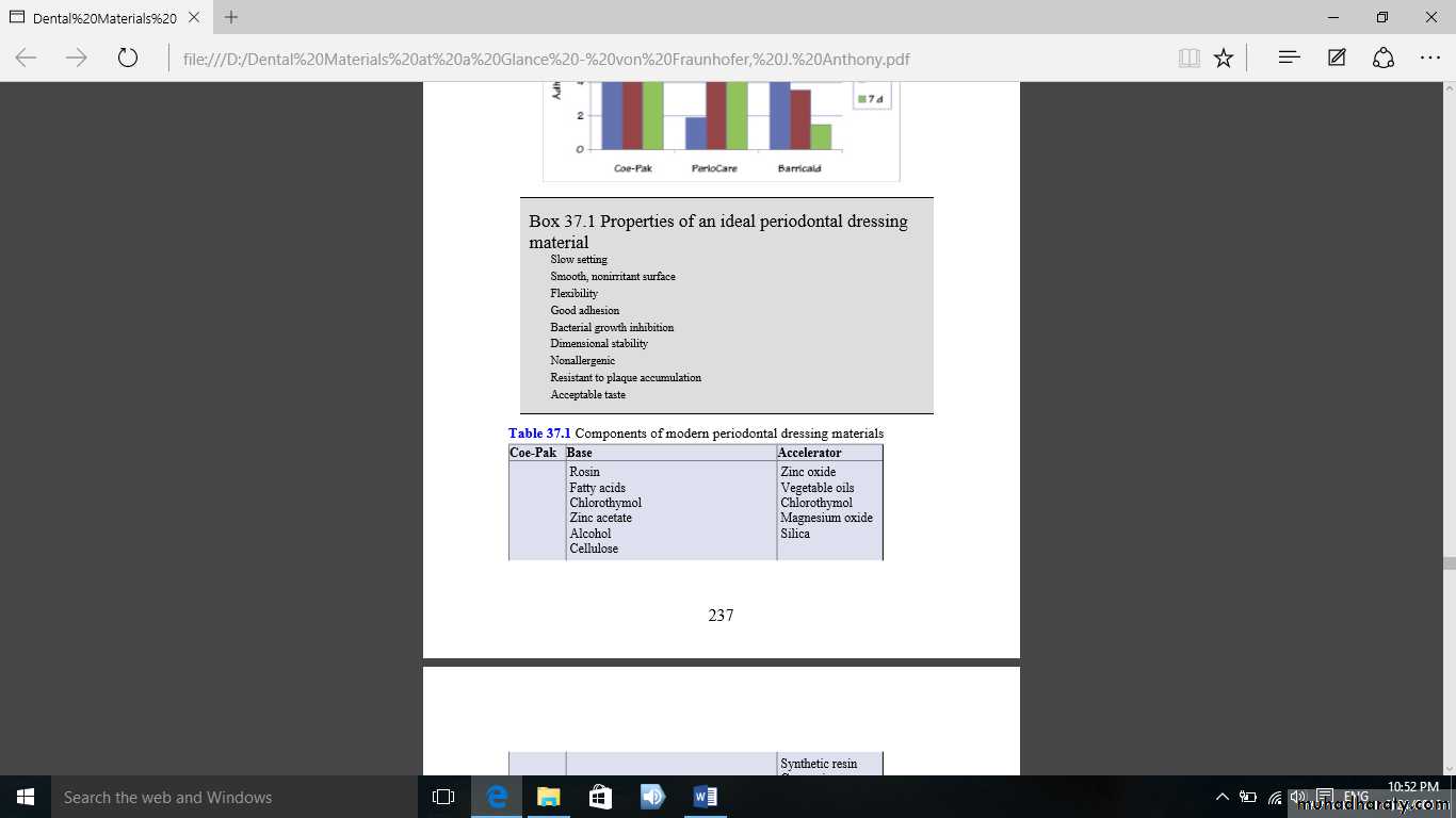 Periodontal surgery involves surgical manipulation of soft tissue to alleviate various problems but, during the histological tissue turnover process, the mucosa requires protection for 6–7 days. In particular, postoperative healing wounds require protection against insult from saliva, trauma, food impaction, and stagnation. Periodontal dressing materials or “packs” are used for this purpose. They also alleviate pain, reduce hemorrhage, facilitate healing, and prevent overgrowth of granulation tissue.Properties of an ideal periodontal dressing material: