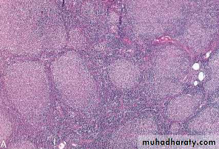 deposition of collagen in bands that divide involved lymph nodes into circumscribed nodules