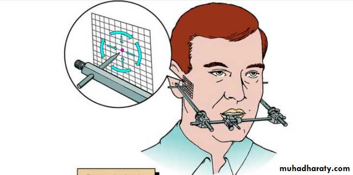 It is placed on the face, with the graduated condylar rods located in a line extending from the outer canthus of the eye to the top of the tragus of the ear & approximately 13mm in front of the external auditory meatus.