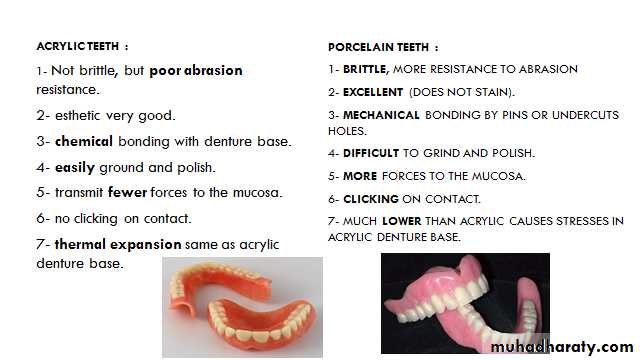 1. Porcelain teeth:We have vacuum fired and air fired. The vacuum is better because they are harder and have luster. Generally porcelain teeth are preferred particularly for young person because they look more vital, very smooth and difficult to abrade.