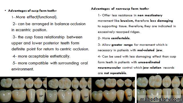 a) Cusp form (anatomical teeth): Anatomical teeth have cusp angles 30, 20 degrees.(angle between the cusp tip and flat occluosal plane)