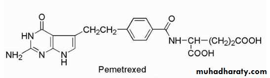 The drug is available in 10-mg vials for IV use. The drug is used to treat leukemias such as hairy cell leukemia, chronic lymphocytic leukemia, and lymphoblastic leukemia. The mechanism of action involves inhibition of the enzyme adenosine deaminase yielding increased cellular levels of deoxyadenosine and deoxyadenosine triphosphate (dATP). The increased levels of dATP are cytotoxic to lymphocytes. Pentostatin is a fermentation product of Streptomyces antibioticus. Resistance appears to involve decreased cellular transport or increased expression of catabolic enzymes. Acid instability prevents oral administration, and the drug is only administered by IV.PEMETREXED (MTA, ALIMTA)