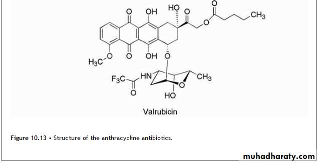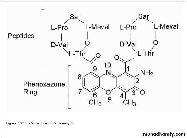 Is known as dactinomycin and contains identical pentapeptides bound through an amide linkage utilizing the amino group of L-threonine with carbonyls at positions 1 and 9. The pentapeptides namely L-threonine, D-valine, L-proline, sarcosine, and L-methylvaline form a lactone via the side chain hydroxyl of L-threonine and the carboxyl group of L-methylvaline (Fig. 10.11).Anthracyclines