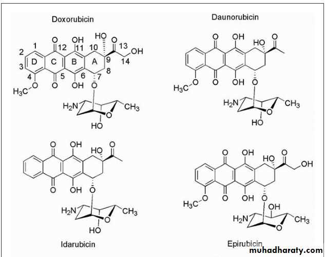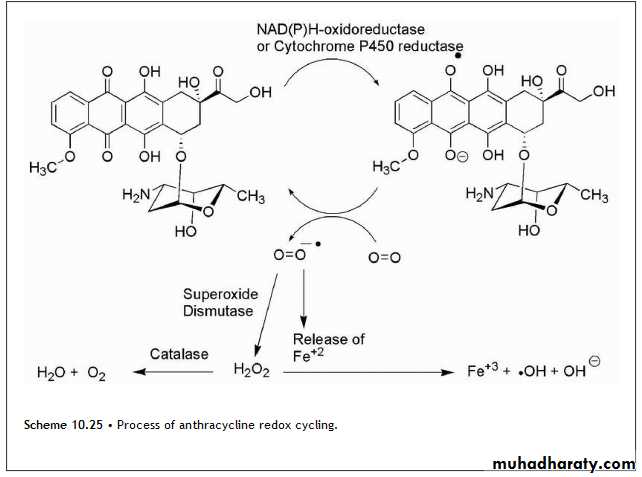 • Although the anthracyclines produce several adverse effects that are typical for antineoplastics, cardiotoxicity is a special concern with this class of agents. The associated cardiomyopathies and congestive heart failure (CHF) have been related to the ability of these compounds to undergo redox cycling Fig(10.25).