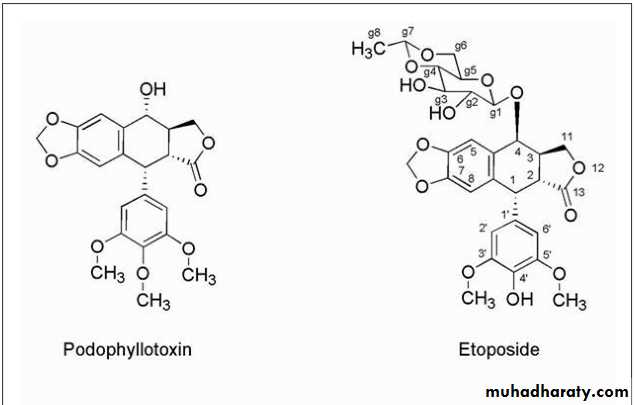 The change in mechanism was associated with removal of the 4′-methyl group of podophyllotoxin. Further alteration in podophyllotoxin involved the addition of the glycosidic portion of the molecules