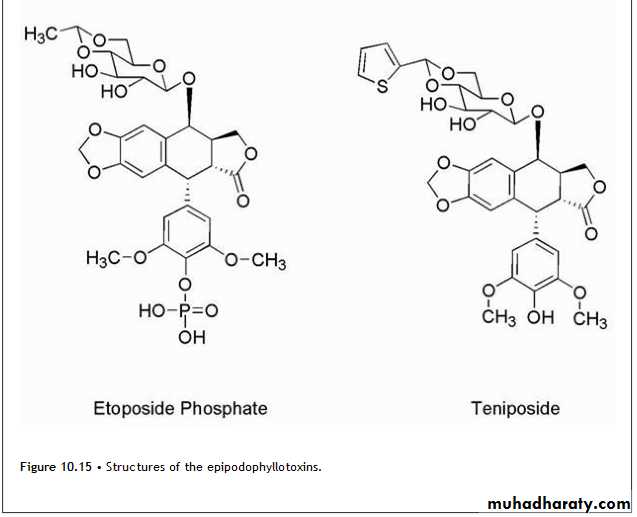 EpipodophyllotoxinsThe epipodophyllotoxins (Fig. 10.15) are semisynthetic derivatives of podophyllotoxin, which is isolated from the mayapple (mandrake) root and functions as an inhibitor of microtubule function.
