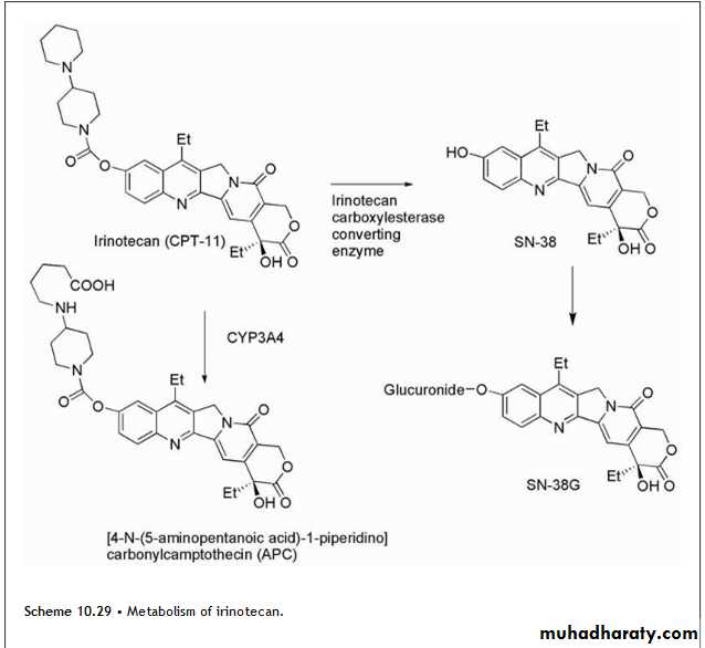 Irinotecan undergoes hydrolysis of its carbamate moiety by irinotecan-converting enzyme to give SN-38, which is 1,000 times more potent than the parent compound (Scheme 10.29). There is wide interpatient variability in the extent of this transformation, which may explain differential responses to the agent. Further metabolism involves the glucuronidation of the resulting phenolic function of SN-38 to give SN-38G, which is inactive.