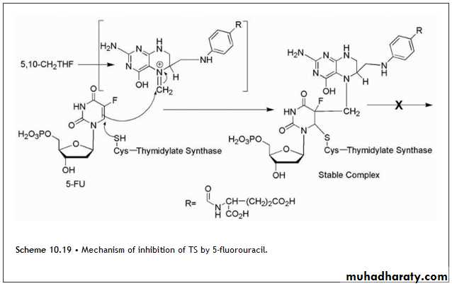 5-Fluorouracil is activated by conversion to the corresponding nucleotide species, 5-fluoro-2-deoxyuridylic acid .The resulting 5-fluoro-2′-deoxyuridylic acid is a powerful inhibitor of thymidylate synthetase, the enzyme that converts 2′-deoxyuridylic acid to thymidylic acid. In the inhibiting reaction, the sulfhydryl group of TS adds via conjugate addition to the 6-position of the fluorouracil moiety (Scheme 10.19), So the chemical mechanism of inhibition of TS by 5-fluorouracil is shown in Scheme 10.19.