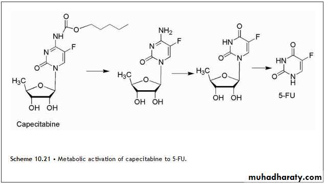 The carbamate derivative of 5′-deoxy-5-fluorocytidine is known as capecitabine, and it is converted to 5-FU through a series of activation steps. The activation sequence is shown in Scheme 10.21.