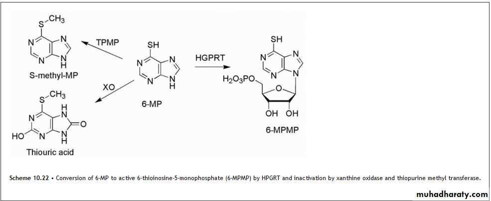 This purine requires bioactivation to its ribonucleotide, 6-thioinosinate (6-MPMP), by the enzyme HGPRT. The resulting nucleotide (Scheme 10.22) is a potent inhibitor of an early step in basic purine biosynthesis, the major antineoplastic action of 6-MP appears to be related to the inhibition of purine biosynthesis.