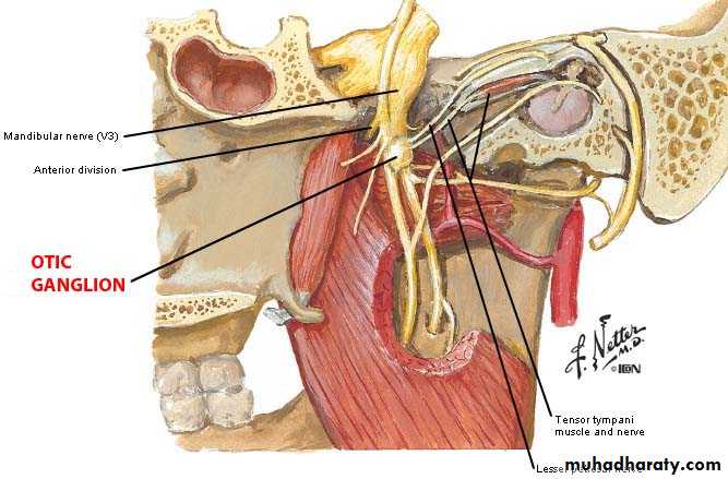 • 1. Auriculotemporal nerve, which supplies the skin of the auricle, the external auditory meatus, the temporomandibular joint, and the scalp. This nerve also conveys postganglionic parasympathetic secretomotor fibers from the otic ganglion to the parotid salivary gland.• 2. Lingual nerve, which descends in front of the inferior alveolar nerve and enters the mouth. It then runs forward on the side of the tongue and crosses the submandibular duct. In its course, it is joined by the chorda tympani nerve , and it supplies the mucous membrane of the anterior two thirds of the tongue and the floor of the mouth. It also gives off preganglionic parasympathetic secretomotor fibers to the submandibular ganglion.
