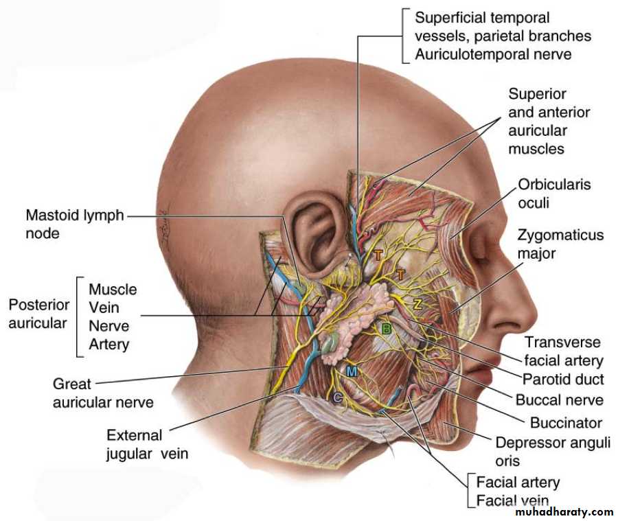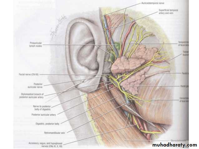1. The auriculotemporal nerve emerges from under cover of the upper end of the parotid gland. The nerve ascends into the temporal region and scalp and divides into branches that supply them.2. The temporal branch of the facial nerve runs upwards and forwards to reach the frontalis muscle that it supplies. It also helps to supply the orbicularis oculi and the auricular muscles.