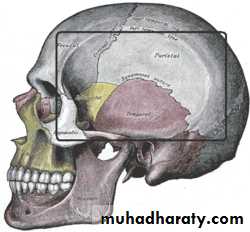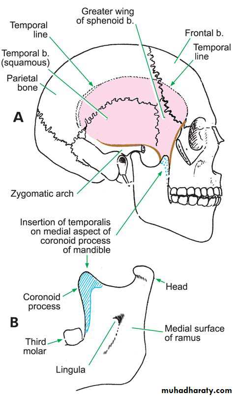 • A. Temporalis muscle:*Origin: The temporalis arises from the temporal fossa on the lateral aspect of the skull. The area includes parts of the frontal, parietal, and squamous temporal bones and of the greater wing of the sphenoid. The tendon passes deep to the zygomatic arch.