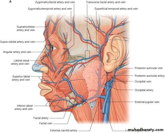 • Parotid gland• The external carotid artery enters the lower part of the posteromedial surface. Ascending within the substance of the gland it divides into its terminal branches (superficial temporal and maxillary) that emerge on the anteromedial surface of the gland