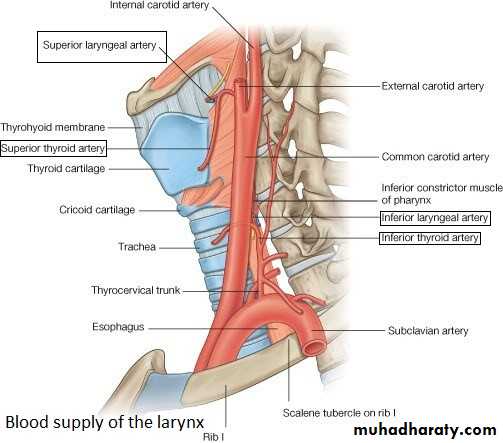 ■■ Upper half of the larynx: The superior laryngeal branch of the superior thyroid artery■■ Lower half of the larynx: The inferior laryngeal branch of the inferior thyroid artery