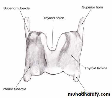 Thyroid cartilage: This is the largest cartilage of the larynx and consists of two laminae of hyaline cartilage that meet in the midline in the prominent V angle (the so-called Adam’s apple). The posterior border extends upward into a superior cornu and downward into an inferior cornu. On the outer surface of each lamina is an oblique line for the attachment of muscles