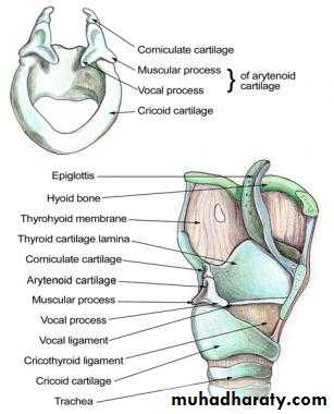 Arytenoid cartilages: There are two arytenoid cartilages, which are small and pyramid shaped and located at the back of the larynx.They articulate with the upper border of the lamina of the cricoid cartilage. Each cartilage has an apex above that articulates with the small corniculate cartilage, a base below that articulates with the lamina of the cricoid cartilage, and a vocal process that projects forward and gives attachment to the vocal ligament. A muscular process that projects laterally gives attachment to the posterior and lateral cricoarytenoid muscles.