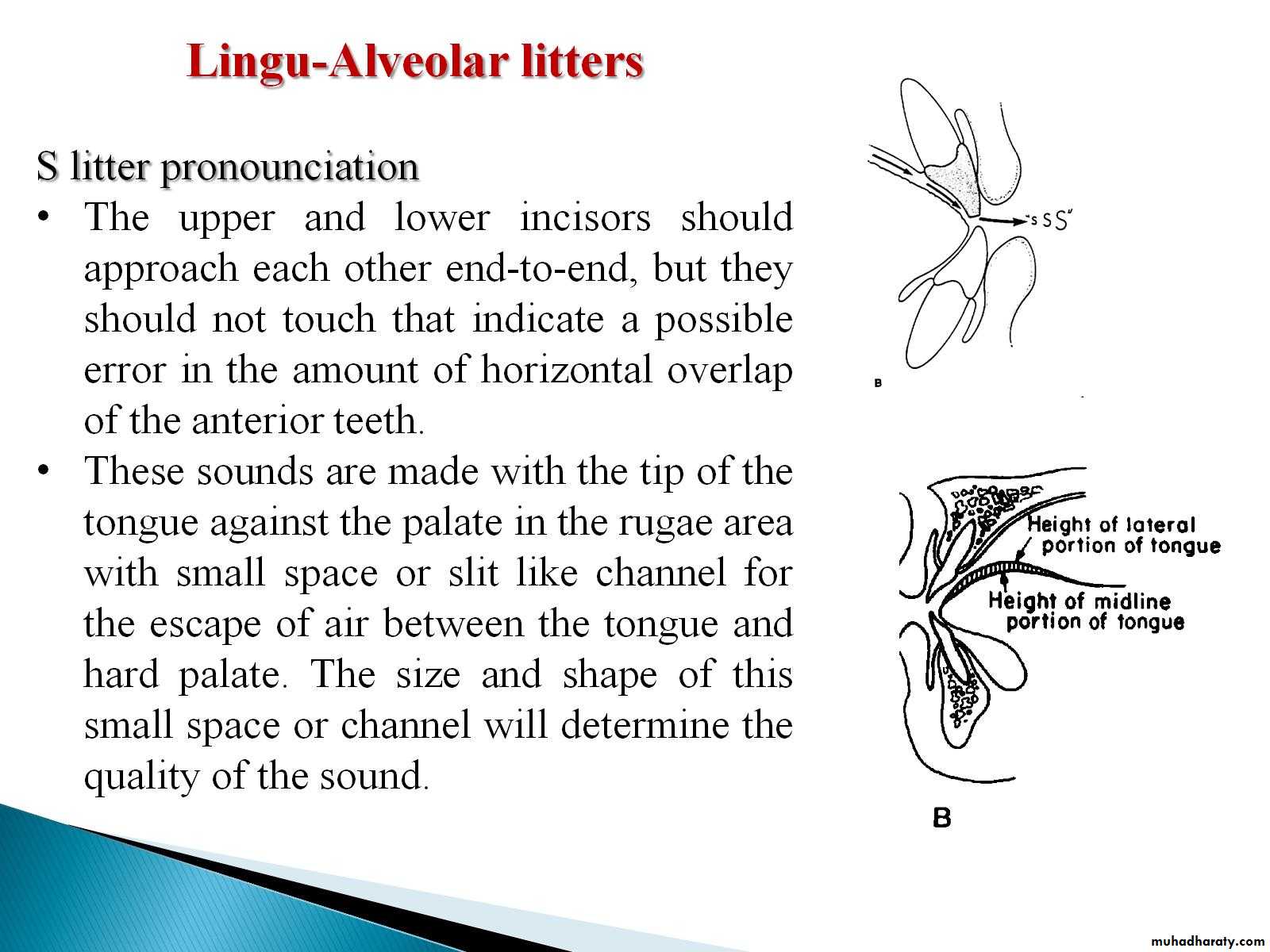 3.Alveolar and Linguoalveolar sounds T , D, S, Z, L are the sounds which makes the contact of the tip of the tongue with the most anterior part of the palate.