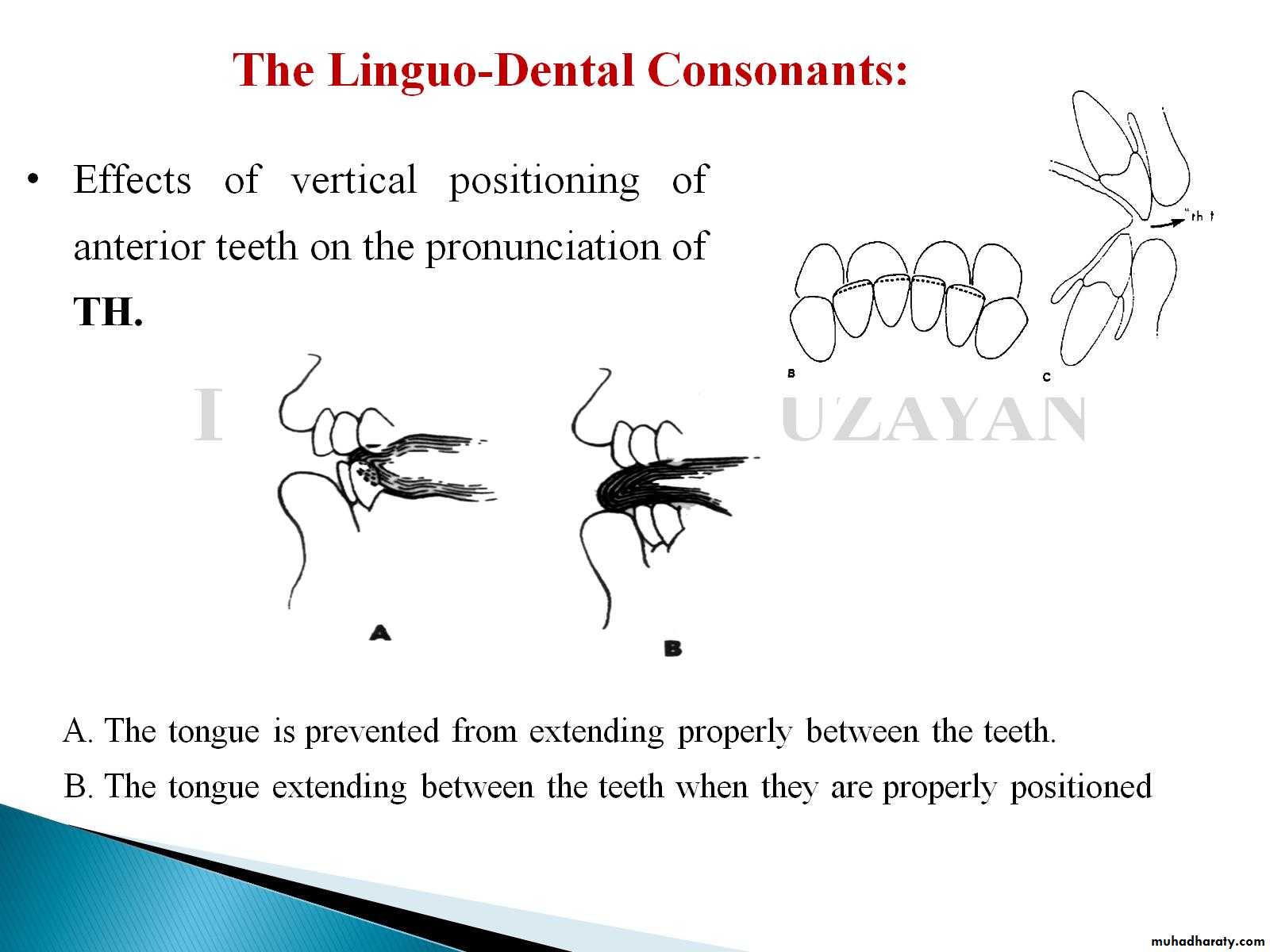 4.Linguodentalsounds Th are made with the tip of the tongue extending slightly between the upper and lower anterior teeth.