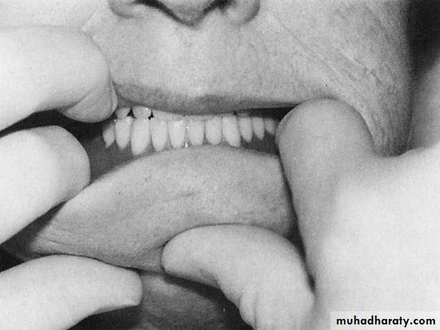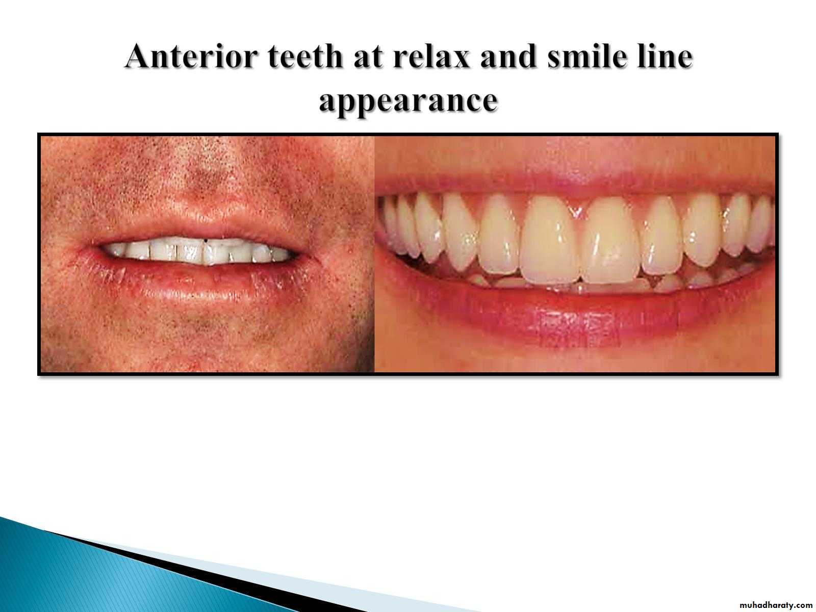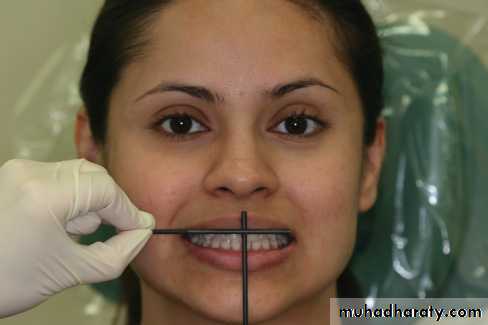 3.Direct the patient to slightly open the mouth and study the relation of the maxillary incisors to the lip. In the average patient, 1- 2 mm of tooth should be visible beyond the lower border of the relaxed lip.