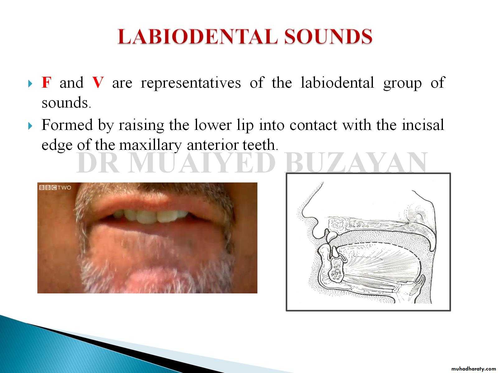 F and V’ are representatives of the labiodental group of sounds. Formed by raising the lower lip into contact with the incisal edge of the maxillary anterior teeth.