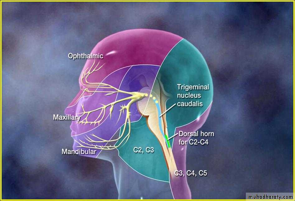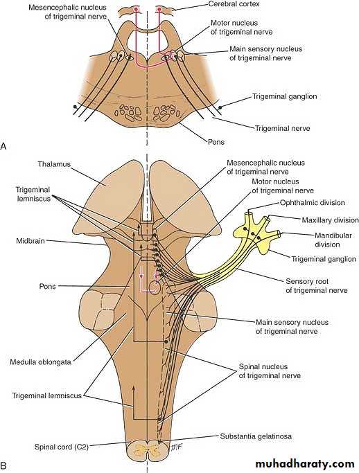 Pain, temperature, touch, and pressure from skin of face and mucous membranes travel along axons whose cell bodies are situated in the trigeminal ganglion.The central processes of these cells form sensory root of trigeminal nerve.