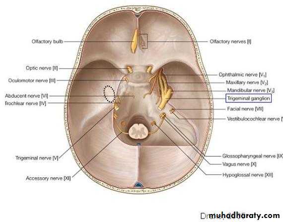 Trigeminal nerve leaves anterior aspect of pons as a small motor root and a large sensory root.It passes forward out of posterior cranial fossa and rests on apex of petrous bone in middle cranial fossa here sensory root expands to form trigeminal ganglion.