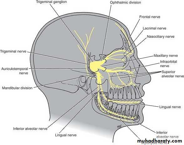 Ophthalmic nerve (V1) contains only sensory fibers leaves skull through superior orbital fissure to orbital cavity.